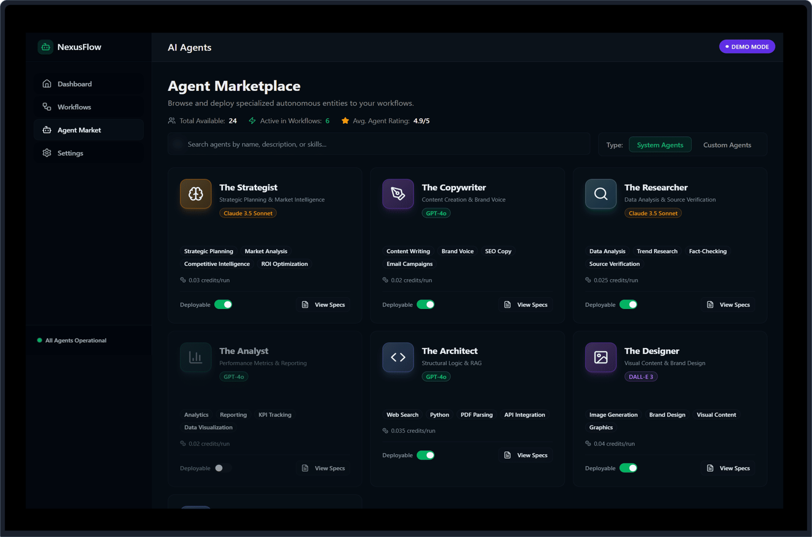 NexusFlow is an enterprise-grade AI orchestration platform that demystifies complex agentic workflows through a transparent, deep-tech interface.